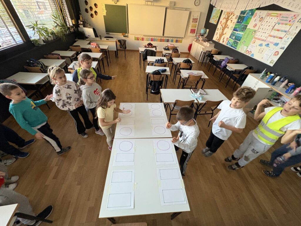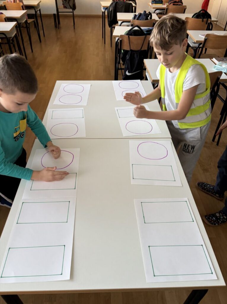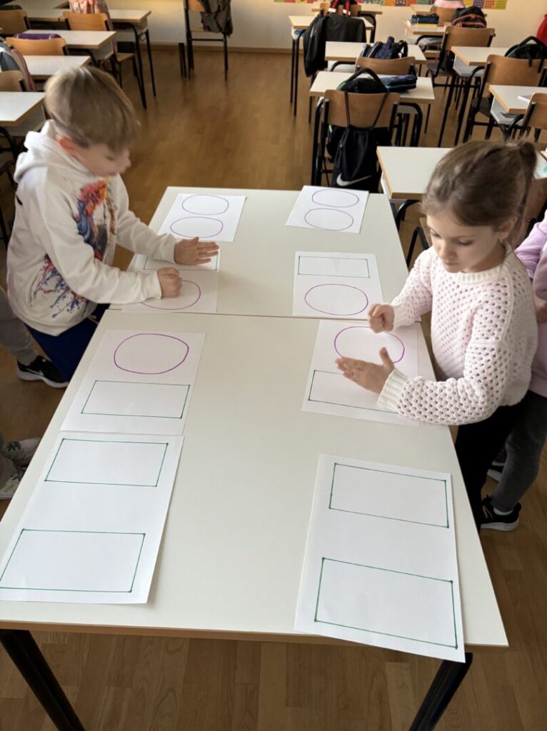 Na papirima se nalaze krug i pravokutnik. Učenici trebaju krug dotaknuti šakom, a pravokutnik ispruženim dlanom. Svaki učenik treba što brže pravilno postaviti dlanove. Ako pogriješi vraća se na početak. Pobjeđuje ekipa koja brže i točnije odradi zadatak.
