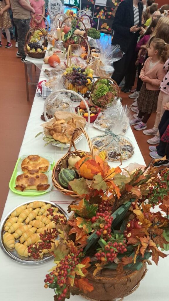 Učenici i učitelji uredili su bogat i šaren stol prepun košara s domaćim kruhom, pecivima, voćem i povrćem. Dvorana je bila ispunjena bojama jeseni, mirisima domaćih delicija i veselim dječjim glasovima.