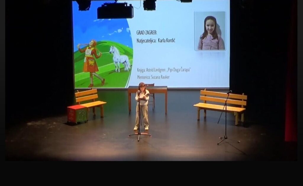 Učenica 3.c razreda Karla Kordić boravila je 20. i 21. studenog u Sisku na državnom natjecanju u čitanju naglas. Od četvrtka ujutro do petka popodne u pratnji školske knjižničarke Ive Crvelin, Karla je boravila u Sisku, a nastupala je već prvi dan kad se održalo natjecanje mlađe kategorije (od 3.-5. razreda). Njezin put od školskog, pobjede na gradskom natjecanju, čime je i došla do državnog natjecanja, mogli ste pratiti na našoj web stranici. Iako nije pobijedila, naša Karla dobila je brojne pohvale kolega i publike za odličan nastup. Karla je čitala odlomak iz knjige “Pipi Duga Čarapa”. Najprije se, kao i na školskom, a zatim i na gradskom natjecanju, kratko predstavila i na zanimljiv način obrazložila zašto se odlučila upravo za tu knjigu, a onda je pročitala odabrani ulomak. Svjetla pozornice i mikrofon nisu joj predstavljali nikakav problem, profesionalno i bez vidljive treme Karlino je čitanje bilo zaista izvrsno.