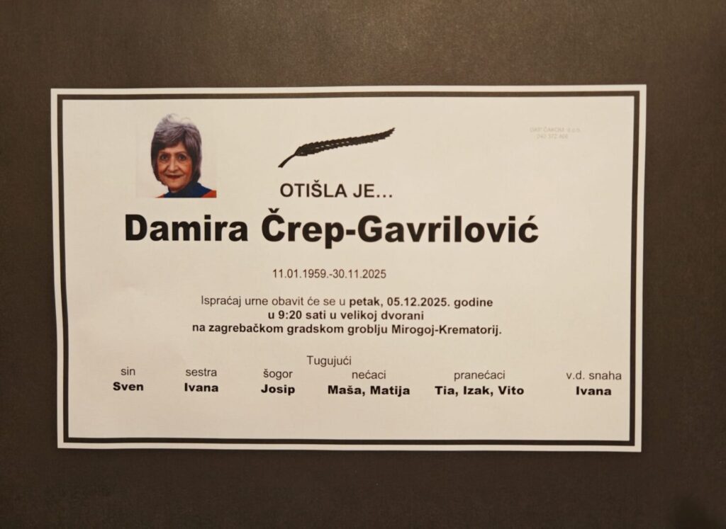 Dana 30. studenoga 2025. godine tiho nas je napustila naša draga, cijenjena i donedavna kolegica, učiteljica Damira Črep Gavrilović.