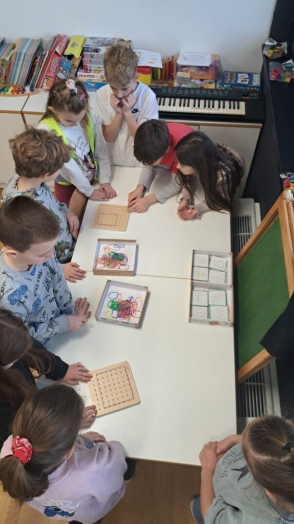 Učenici su međusobno lančano zadavali i rješavali zadatke na geopločama i time si opipljivo predočili množenje brojeva! Na kraju su se i poigrali krerirajući razne šarene likove.